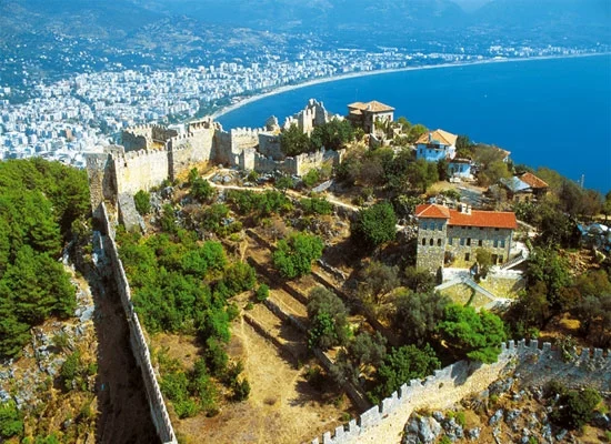 Een van de bekendste badplaatsen aan de Turkse Rivièra is Alanya. Deze plaats vlijt zich tegen een imposante rots aan die opduikt tussen het Cleopatrastrand en het Ooststrand. Hoog op de rotsen, op een kleine kaap ligt het oude Alanya, het antieke Korakesion, dat later tijdens het Seldsjoekse Rijk Alâiye werd genoemd. Het stadsbeeld wordt gedomineerd door de indrukwekkende Seldsjoekse Rode Toren met imposante stadsmuren uit het jaar 1225.