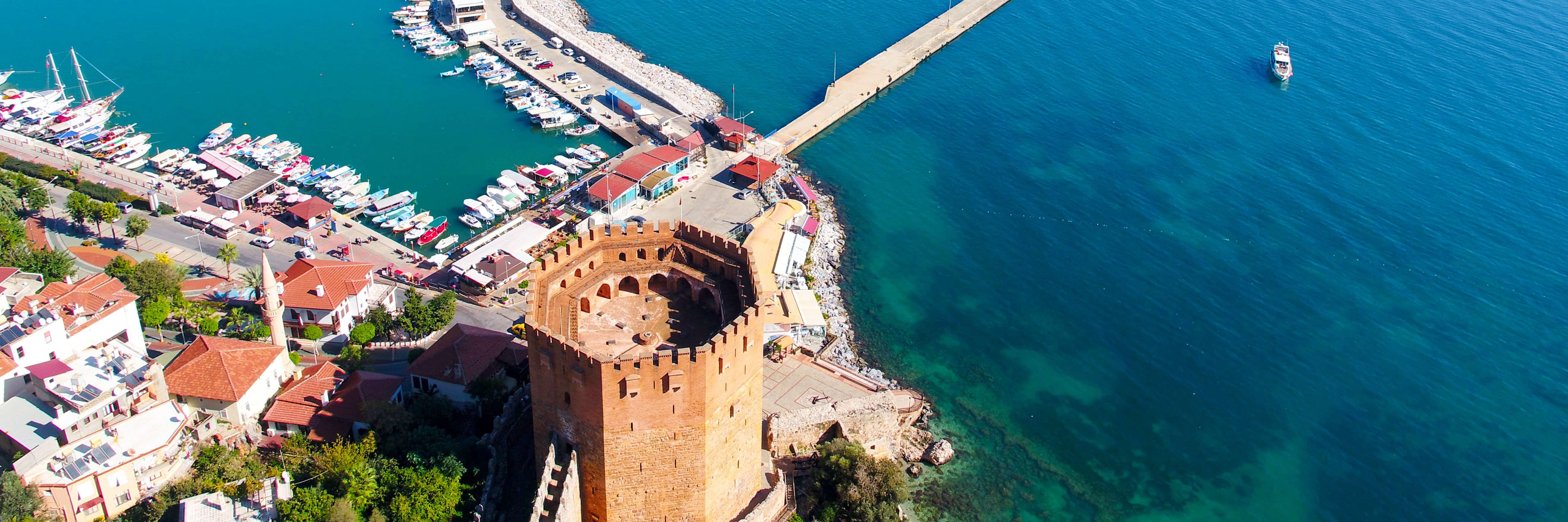 Een van de bekendste badplaatsen aan de Turkse Rivièra is Alanya. Deze plaats vlijt zich tegen een imposante rots aan die opduikt tussen het Cleopatrastrand en het Ooststrand. Hoog op de rotsen, op een kleine kaap ligt het oude Alanya, het antieke Korakesion, dat later tijdens het Seldsjoekse Rijk Alâiye werd genoemd. Het stadsbeeld wordt gedomineerd door de indrukwekkende Seldsjoekse Rode Toren met imposante stadsmuren uit het jaar 1225.