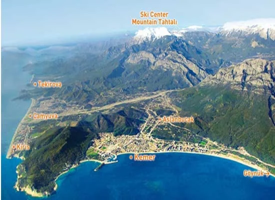 Kemer, dat ooit een vissersdorpje was, ligt aan de voet van het reusachtige Taurusgebergte en op ongeveer 45 km van Antalya. Winkelliefhebbers kunnen hier hun hart ophalen aan de grote verscheidenheid aan winkels, alles is er te vinden, zoals kleding, goud, tapijten, leer en kunst. Ondanks de populariteit van Kemer is het landschap nagenoeg ongerept. Bijna alle hotels en appartementen zijn laagbouw en het centrum is deels autovrij. Kemer is door de jaren heen uitgegroeid tot een prachtig, indrukwekkend vakantieoord met een moderne jachthaven, gezellige barretjes, restaurants en exclusieve boetieks.